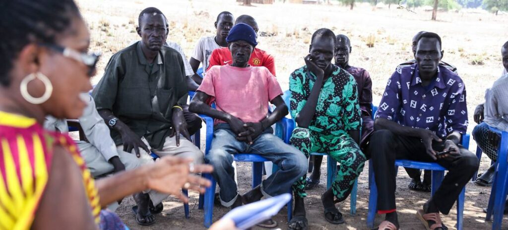An UNMISS officer discusses water scarcity with farmers to help prevent conflict between with the crop farming community in Kworijik, South Sudan.