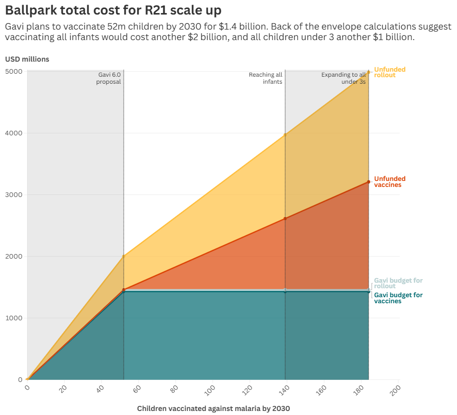 Sources: Authors’ calculations based on Gavi 6.0 business case, MVIP rollout costs, age-specific population of 20 countries with highest malaria incidence • Rollout costs are extremely conservative (i.e., high, reflecting full per child cost of the pilot, which is unlikely to be replicated at greater scale).